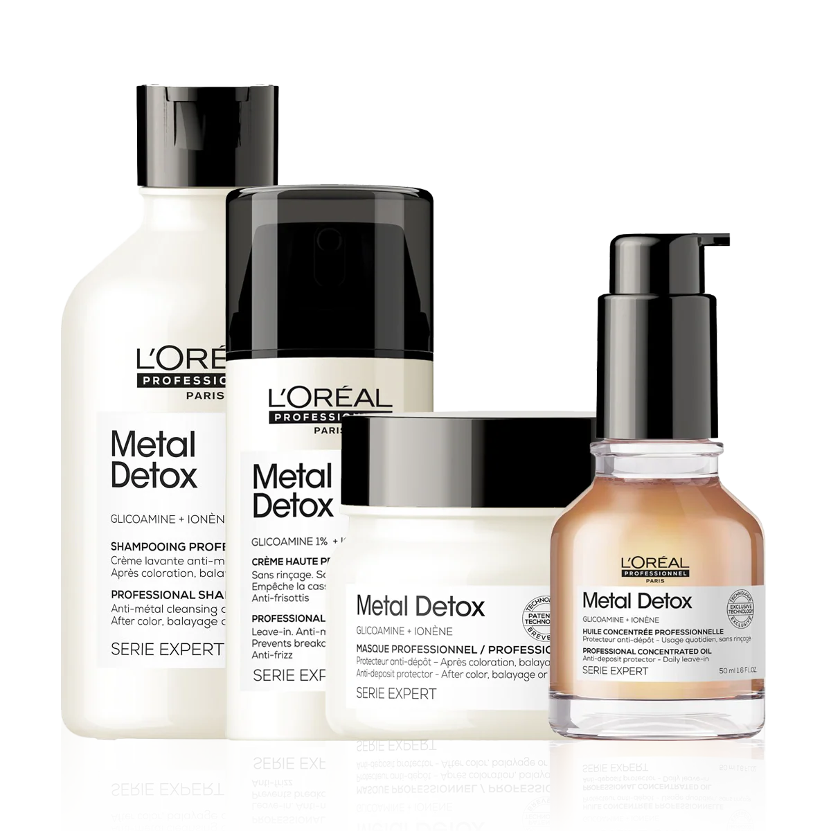 The L'Oréal Professionnel Serié Expert Ultimate Metal Detox Bundle is a deluxe haircare set designed to protect against colour fade and minimise the risk of breakage. Enriched with glicoamine, the formulas work in synergy to remove the build-up of copper deposits in the hair, helping to leave the lengths feeling fresh, clean and visibly vibrant.